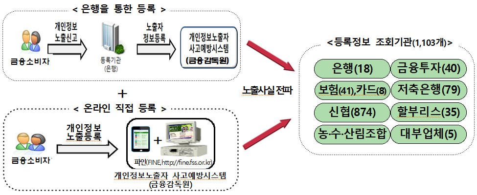 개인정보노출자 사고예방시스템은 개인정보가 노출된 금융소비자가 은행 영업점을 방문하거나 PC 또는 스마트폰을 이용하여 금감원 금융소비자정보포털 「파인」에 개인정보 노출사실을 등록할 경우 신규계좌 개설, 신용카드 발급 등 노출자 명의의 거래 시 본인확인절차를 강화하고 명의도용이 의심될 경우 거래를 제한함으로써 금융사고를 예방할 수 있는 시스템이다.